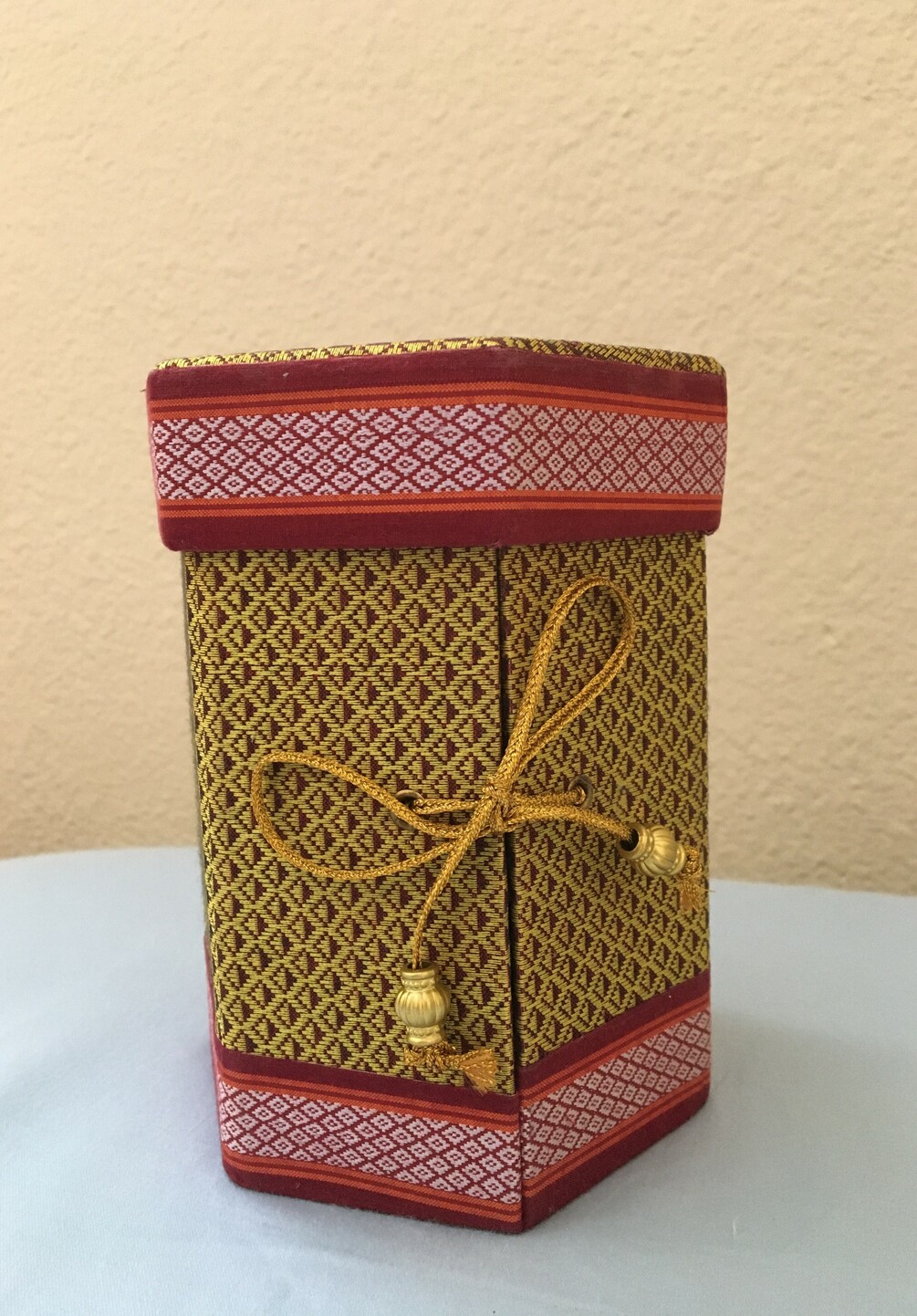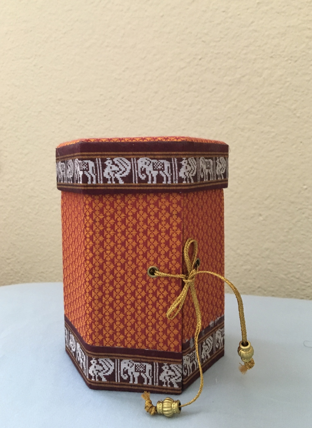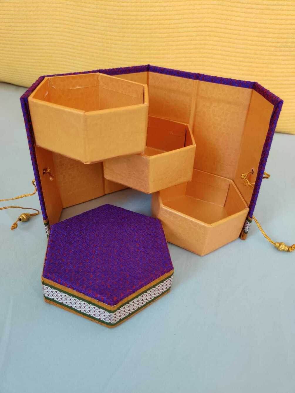 A hexagonal shaped gift box is collapsible which could be used for personal items like earrings, keepsakes, little girl hair accessories or used as a pill box.